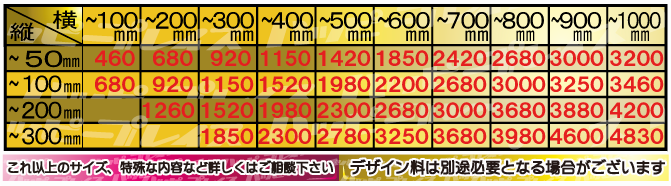 レギュラーカラーを基本に、サイズでの計算となります。後は使用するカラー、制作内容によって割増価格となります。詳しくはお見積もり致しますので、お問い合わせ下さい。