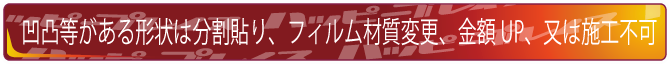 | 空気中の細かなチリ・ホコリが極力混入しないよう、最善を尽くすのは当然なのですが、100%入らないという保証が御座いません。明らかに目立つ大きなゴミが入った場合は貼り直し等で対応させて頂きます。 「糊ズレ」という跡が残る場合があります、これはフィルムを強く引っ張ってしまったために発生する症状です。同じく、極力発生しないように致しますが、どうしても出てしまう事があるため、あらかじめご理解・ご了承頂ければと思います。 |