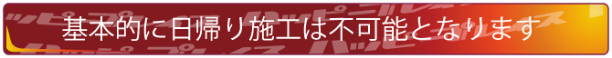 | プロテクションフィルムは専用の施工液と水を使って貼るため、乾燥時間が必須となります。 一見問題ないように見えても、1日経過すると浮いてくる場合があるため、確実を期すためにもお車は必ずお預かりが前提となります。代車の準備はあるのですが、1台しか保有していないため、ご相談させて頂ければと思います。 |